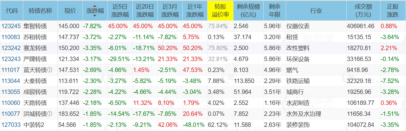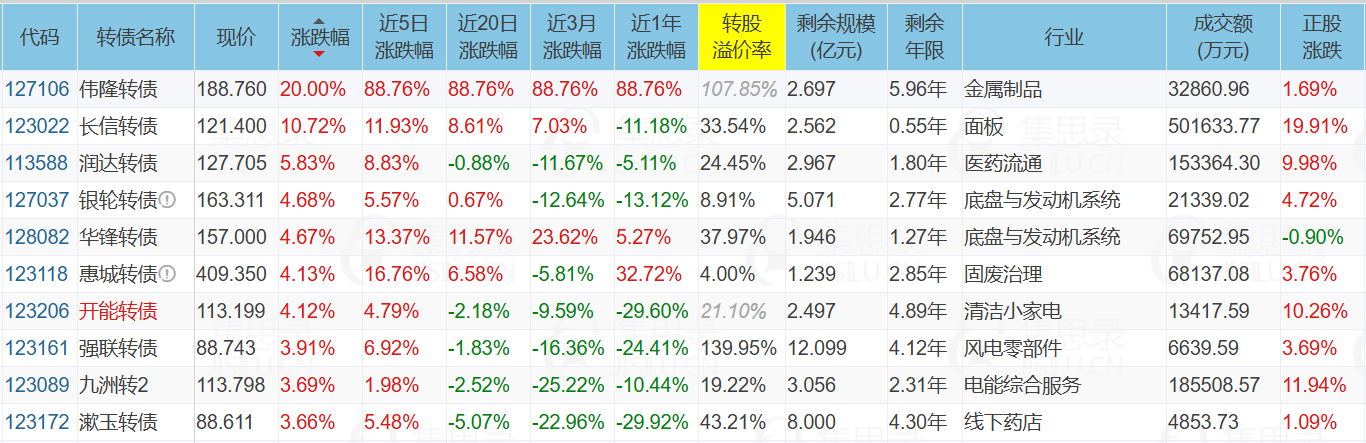 瀛通通讯(2.33%)、小熊电器(-7.72%)、长信科技(19.91%)、大秦铁路(-7.52%)、伟隆转债(20.00%)