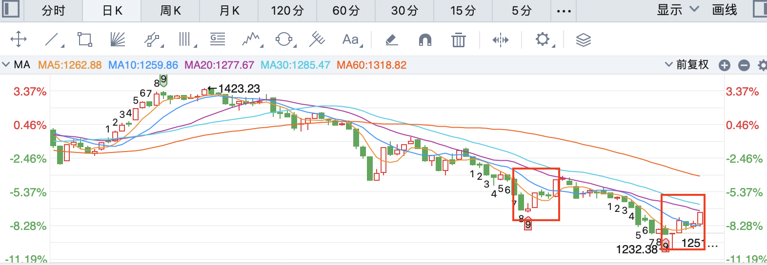 今天的上涨和上一轮的走势有点相似,可以看下图的两个红框,也是在走出底分型后的第三天大涨,走出光头阳线,但是都没能触及20日均线,次日触及20日均线后又开始掉头向下。前几轮下跌均是如此,20日均线这个压力位始终未能突破站稳。