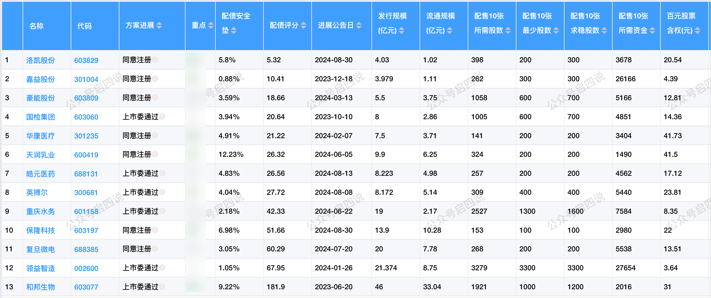 小规模配债股还剩洛凯股份(1.02亿)、嘉益股份(1.11亿)。