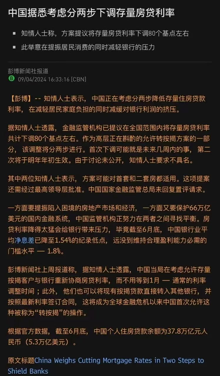 3、彭博社今天又报道了「转按揭」这个政策,据说高层正在考虑分两步下调存量房贷利率,首次下调可能就是未来几周内的事,第二次将于明年年初生效。