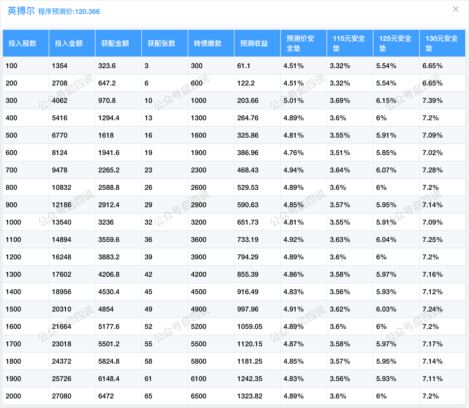 程序预测上市价120.366元,配债所需股数和安全垫可以参考下图: