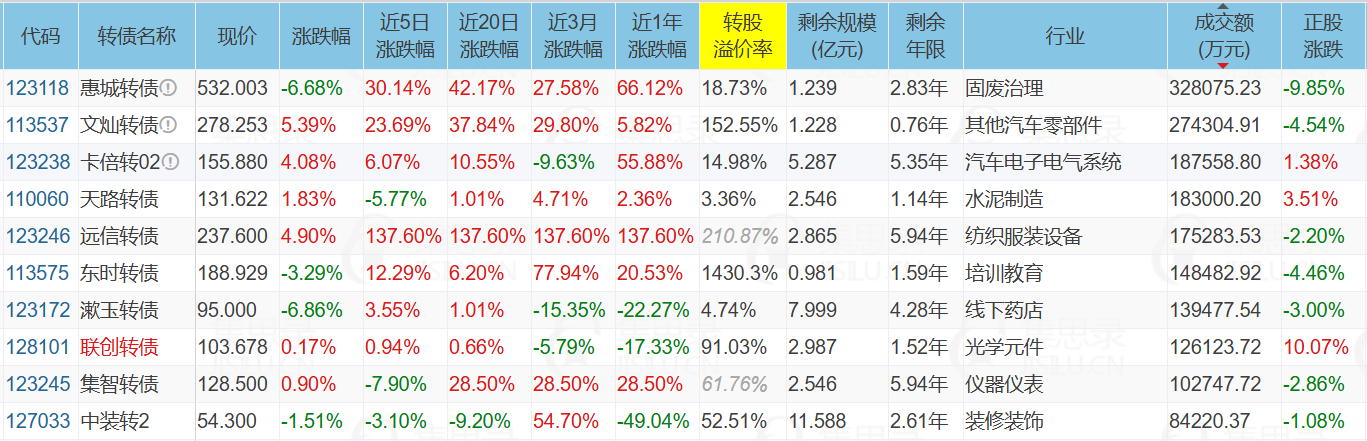 可转债等权指数,今天涨幅-0.53%,中位数106.999元,位于四星级估值区,成交额399.15亿。