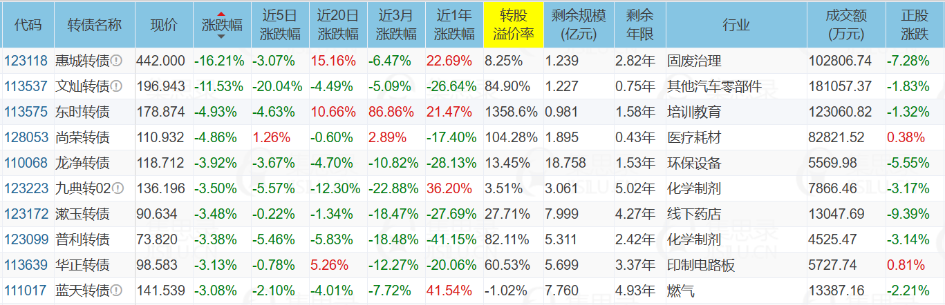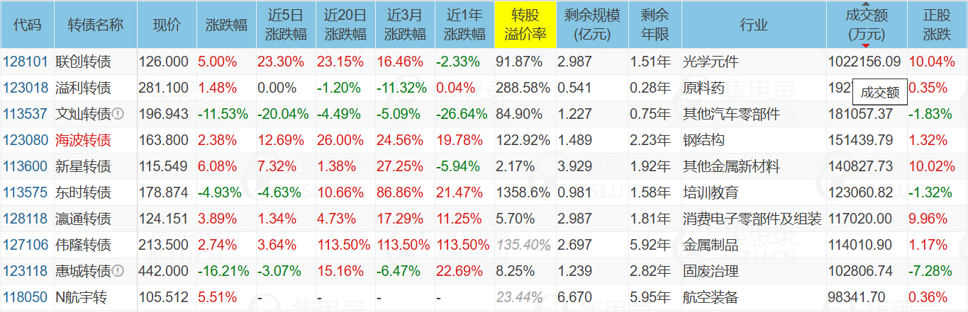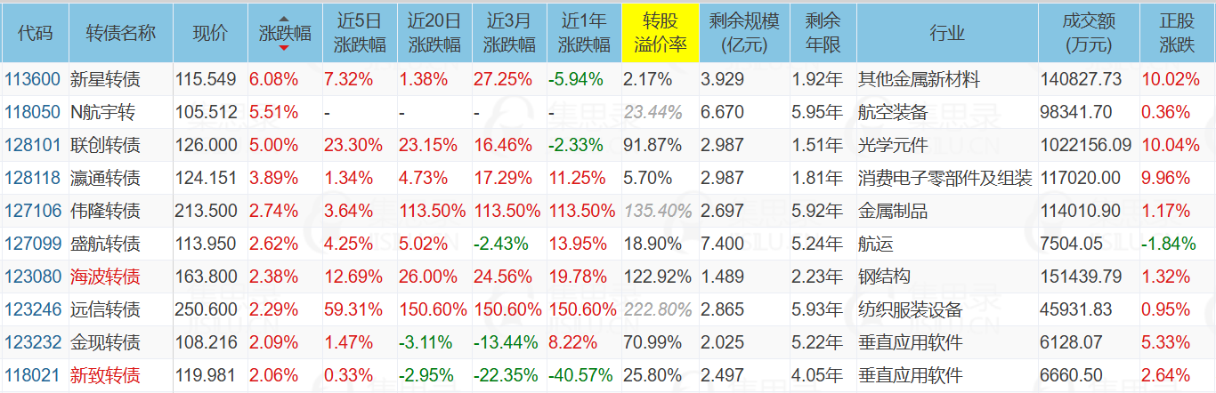 联创电子(10.04%)、N航宇转(5.51%)、惠城转债(-16.21%)
