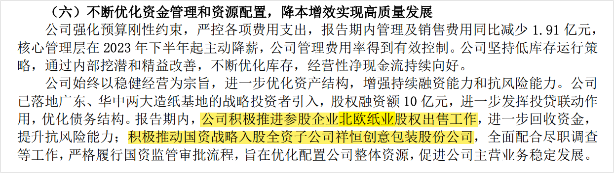3)北欧纸业出售、全资子公司的20亿往来款,在继续推进中,后续满足披露条件时会披露。