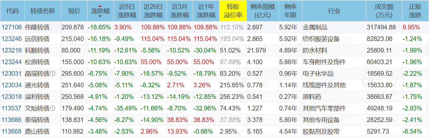 联创电子(-7.96%)、远信转债(-16.18%)、伟隆转债(-18.65%)