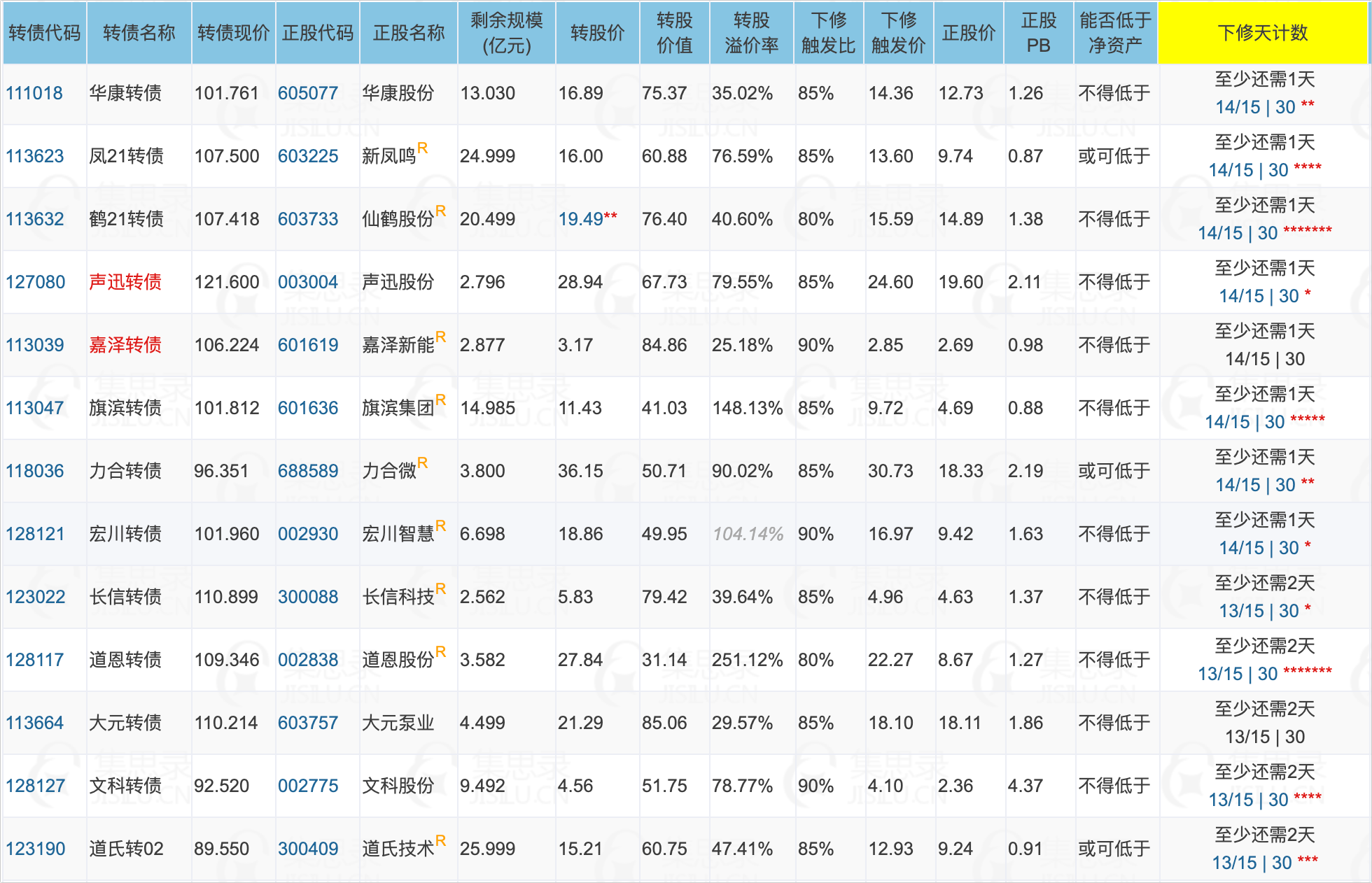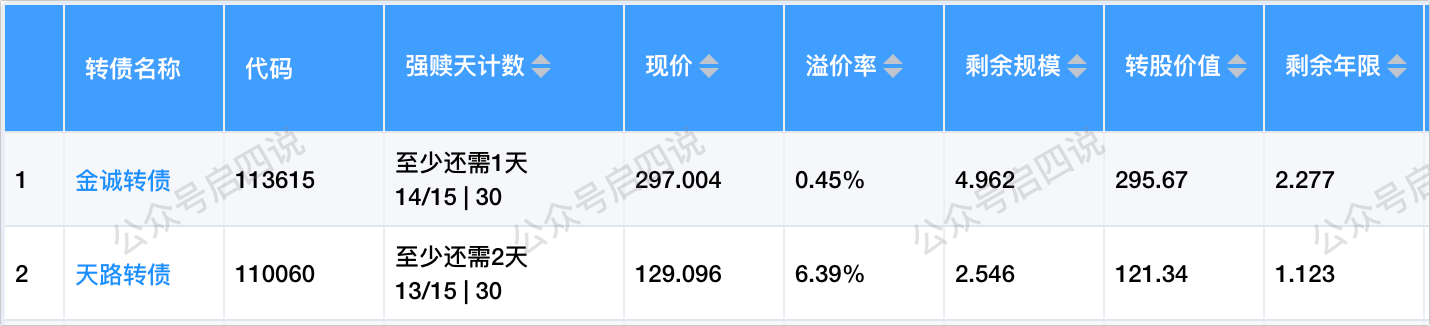 其中天路转债未来7个交易日中满足2天即可,如果持有需要关注强赎进度。