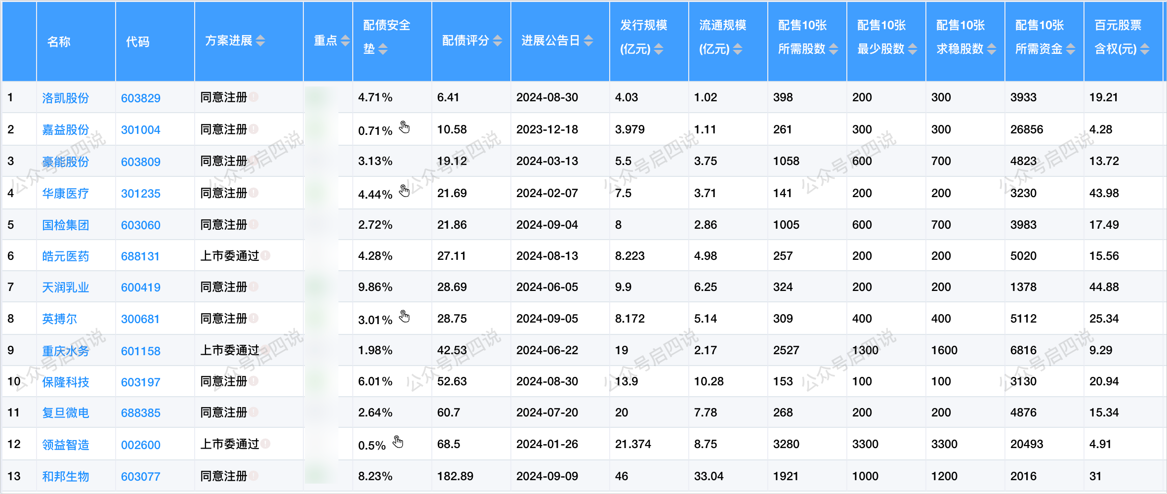 小规模配债股还剩洛凯股份(1.02亿)、嘉益股份(1.11亿)。