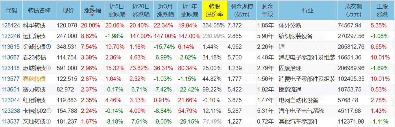 1、涨幅榜榜一科华转债,今天20%涨停。我推测可能这次申报回售的人比较多,资金提前知道了剩余规模较小,因此进行了抢筹。如果真的能把剩余规模缩减到1亿以下,那就有可能复制天创转债的神迹。