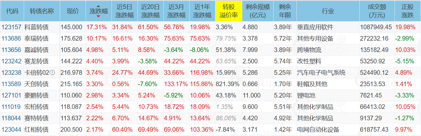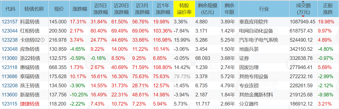红相股份(9.97%)、科蓝软件(19.98%)、申昊科技(-19.99%)、科蓝转债(17.31%)