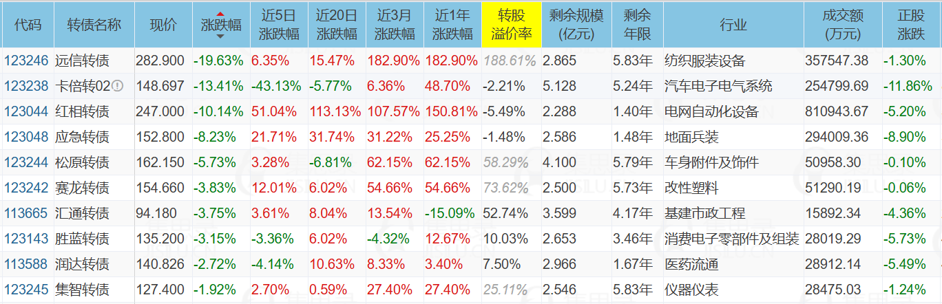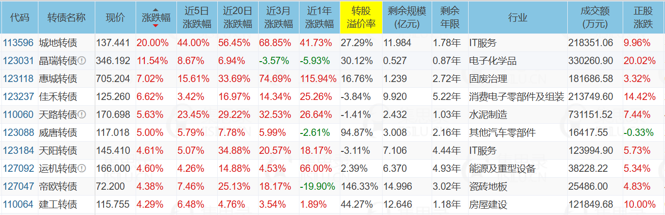 西藏天路(7.44%)、华体科技(10.00%)、城地香江(9.96%)、世运电路(-7.09%)、城地转债(20.00%)、卡倍转02(-13.41%)、远信转债(-19.63%)