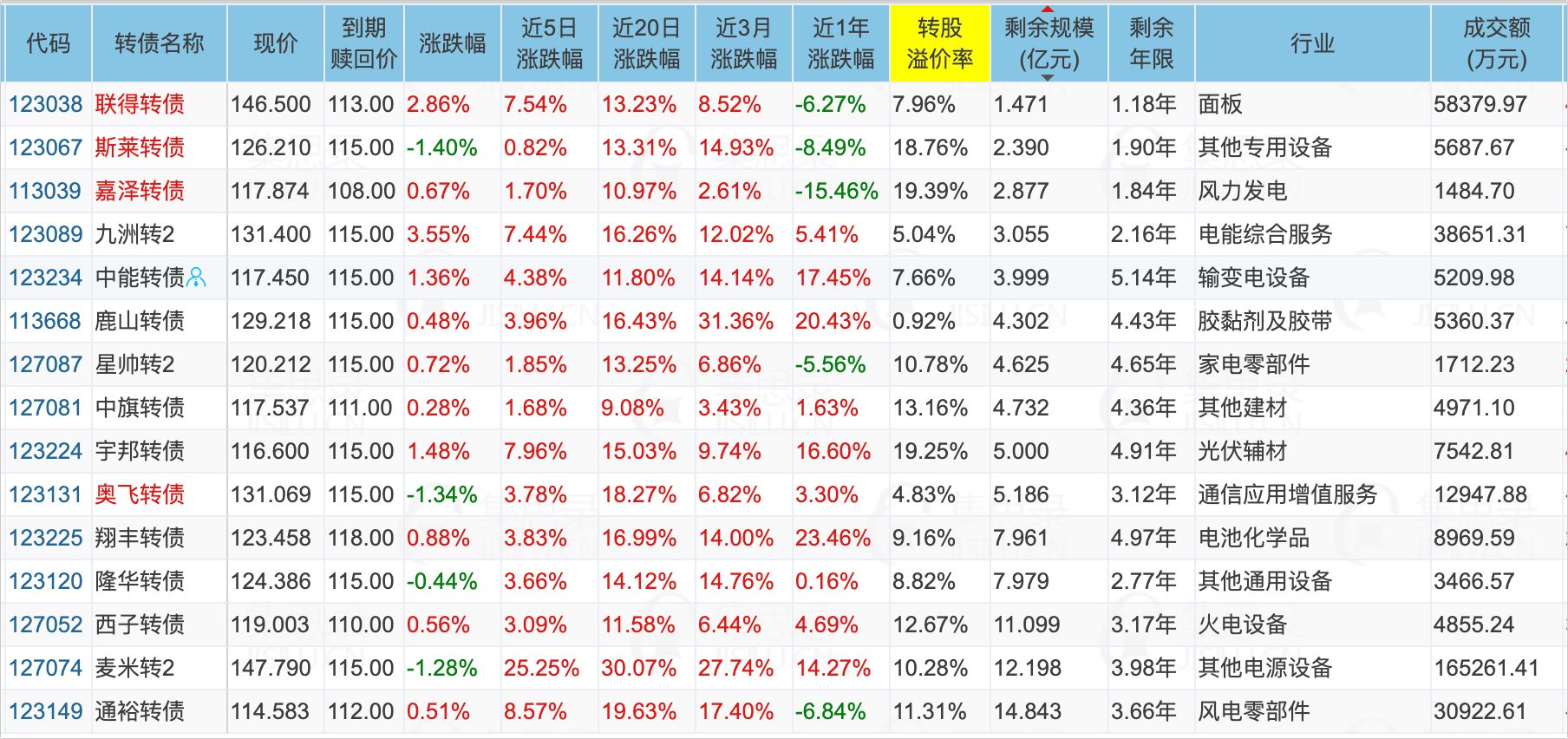 光伏相关转债非常多,可以优先关注这些,溢价率低于20%,剩余年限大于1年,剩余规模小于15亿的:
