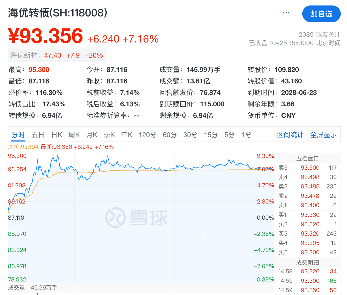 1、海优转债,93.8减仓1/5,92接回减仓的部分。