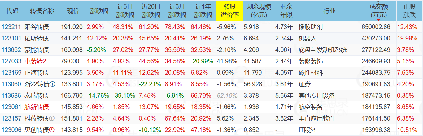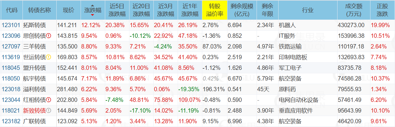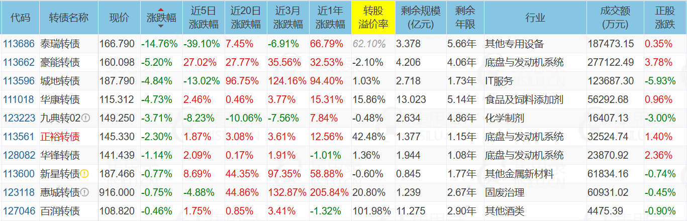 ST中装(5.15%)、拓斯达(19.99%)、城地香江(-5.93%)、泰瑞转债(-14.76%)