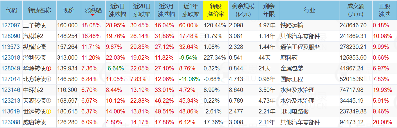 双良节能(-10.00%)、旭升集团(4.23%)、宏辉果蔬(10.06%)、华体科技(9.99%)、三羊转债(18.08%)、汽模转2(16.46%)