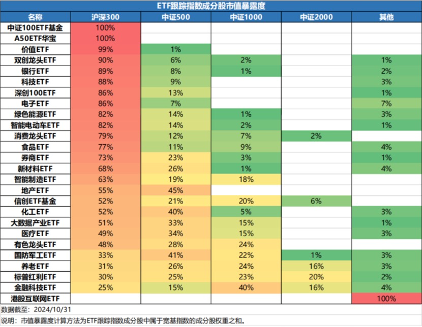 下面这张图,统计了不同指数基金成分股在相应宽基指数中的占比,比如下面的银行ETF,89%的成分股在沪深300中,8%的成分股在中证500中,1%的成分股在中证1000中。