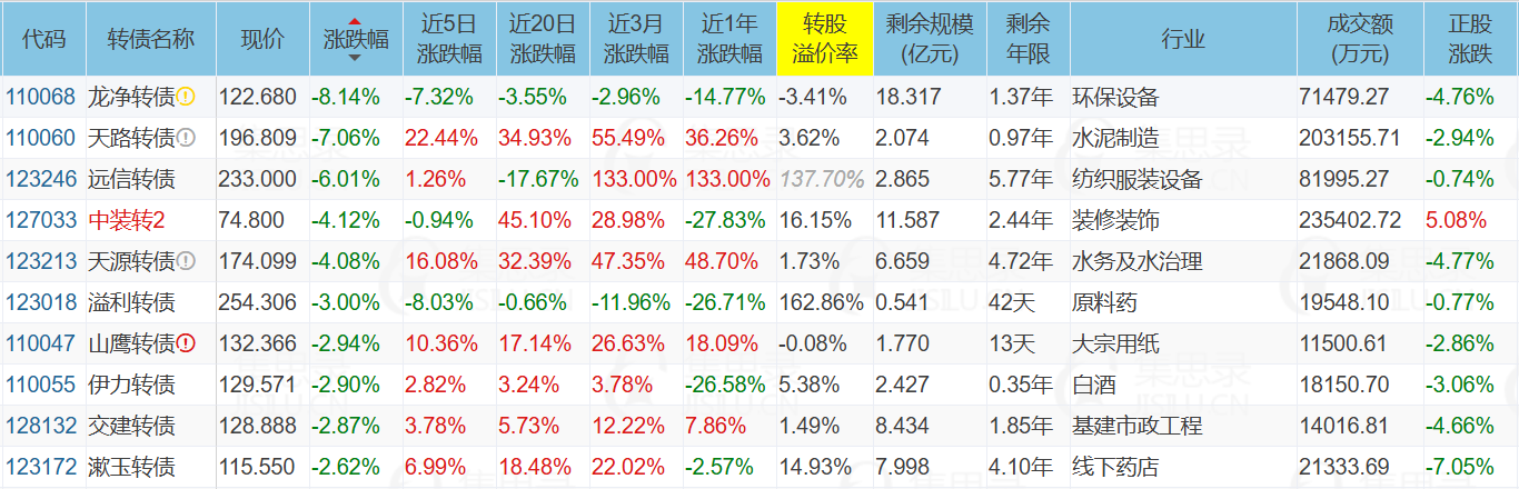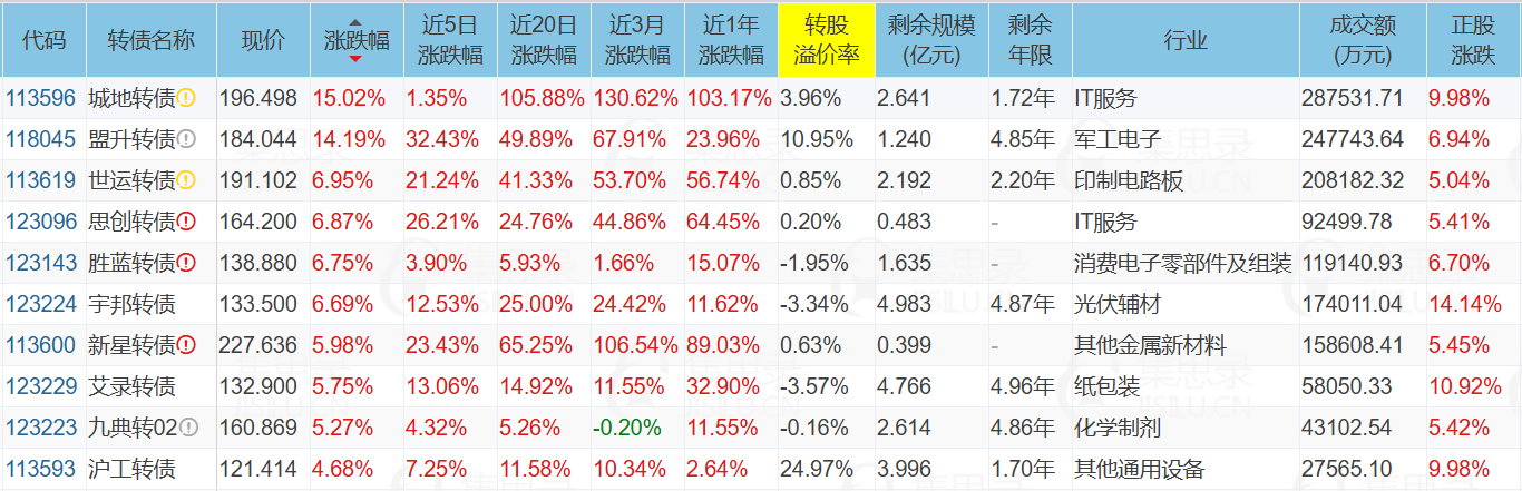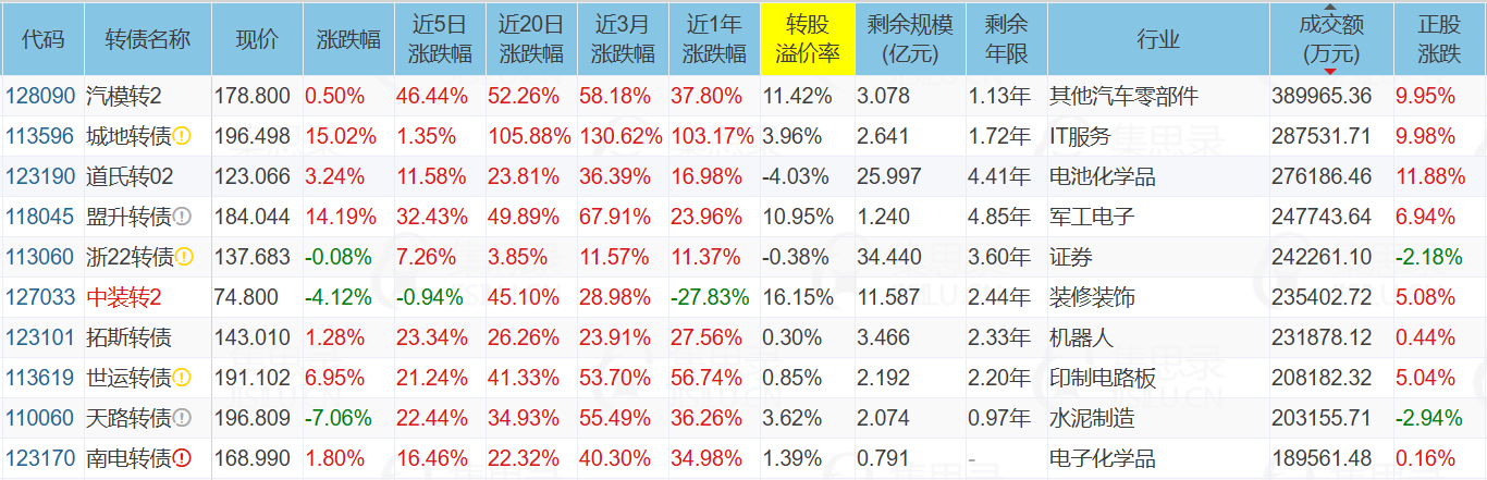 天汽模(10.05%)、威唐工业(11.52%)、嘉元科技(15.08%)、天路转债(19.92%)、溢利转债(-16.24%)、汽模转2(20.00%)