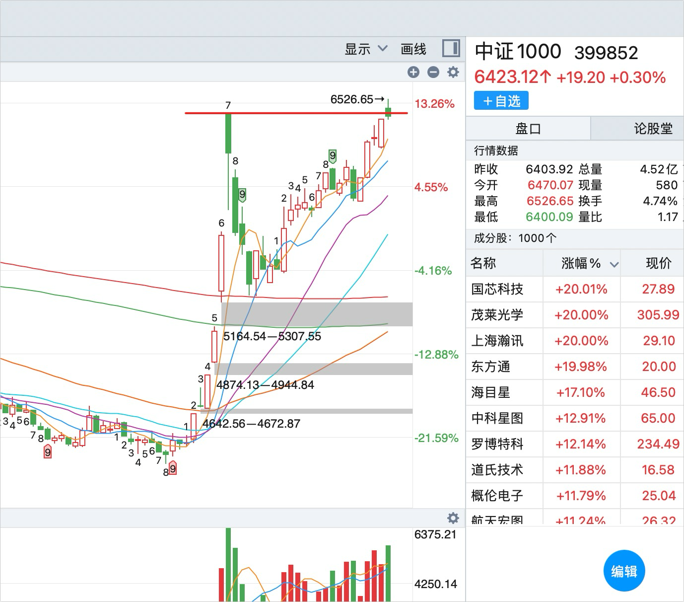 现在中证1000和2000都创了10月8日以来的新高,市场约40%的股票都在近期创新高,压力位一突破,后面就是一马平川,要进攻新的根据地了。中证全指距离前高也只有一步之遥,我还是继续好市场上涨的潜力。