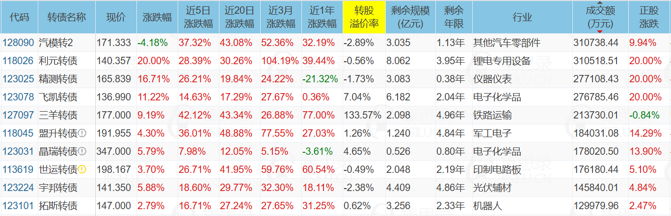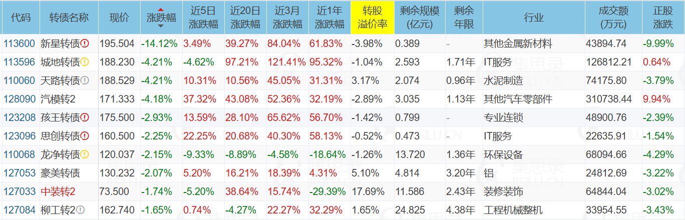 天汽模(9.94%)、精测电子(20.00%)、精测电子(20.00%)、上海沪工(10.00%)、深圳新星(-9.99%)、N洛凯转(57.30%)、利元转债(20.00%)、精测转债(16.71%)、英搏转债(46.42%)