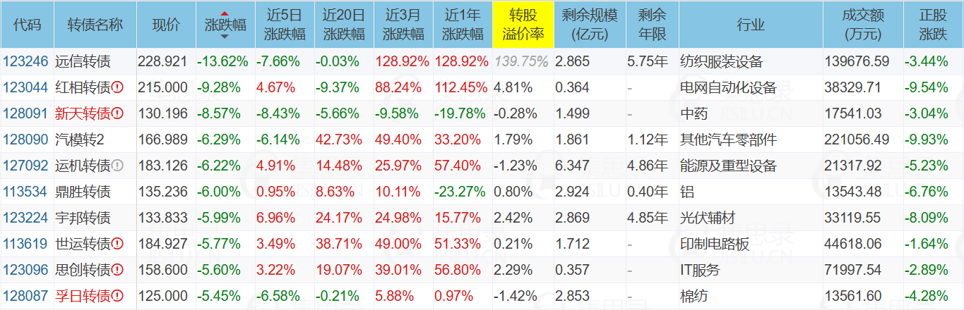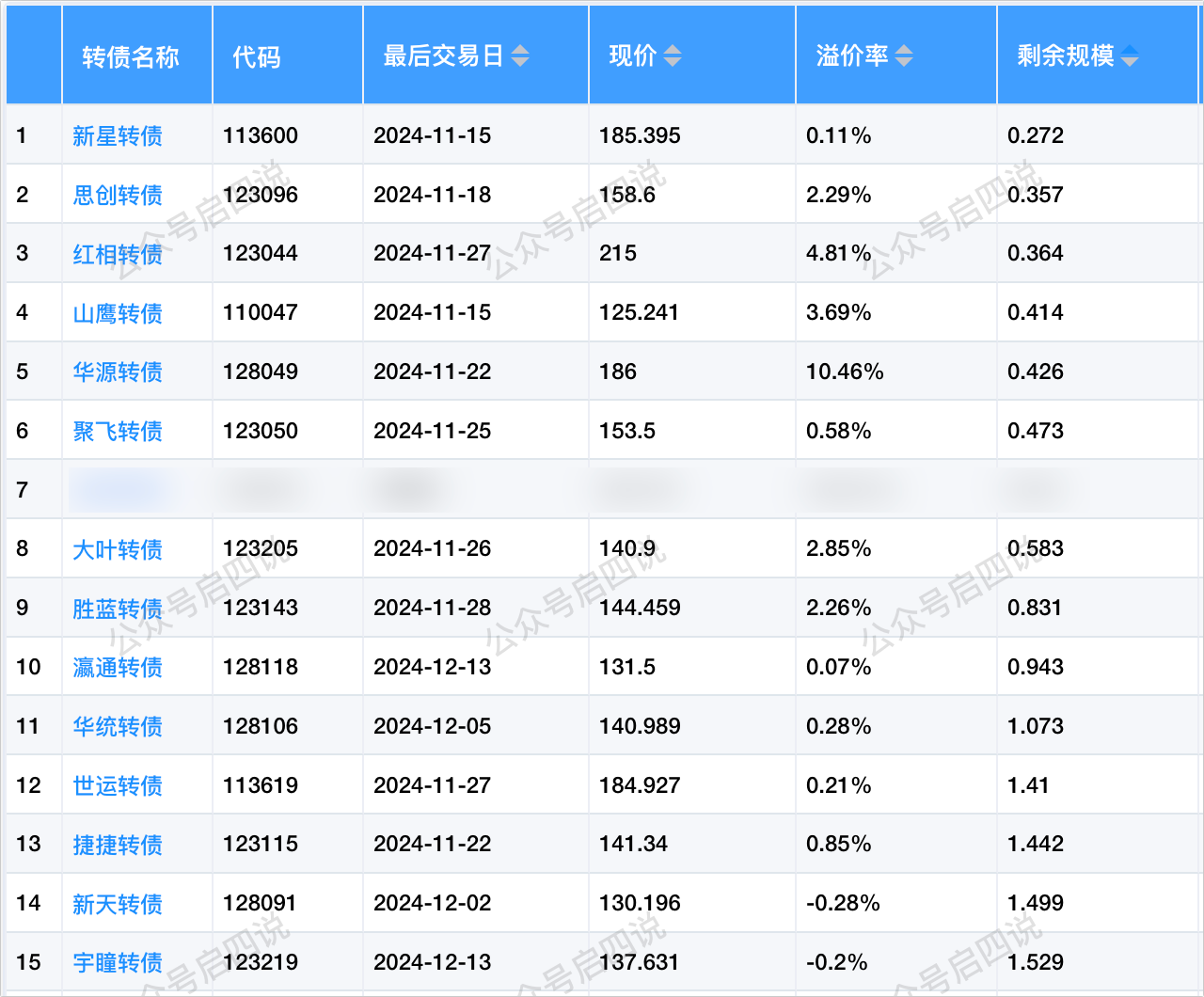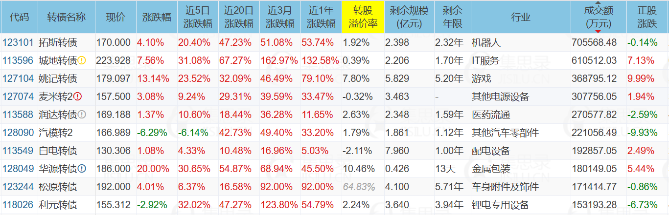 类似的极小规模+低溢价率的还有下面这些转债,未来有妖起来的可能。不过要注意新星转债、山鹰转债明天就到期了,还有一些高价债如红相转债、世运转债近期涨幅很高了,想博弈一定要先预估好亏损幅度,并确保自己能承受,这两天已经有好几个粉丝告诉我追高被套极其痛苦了。