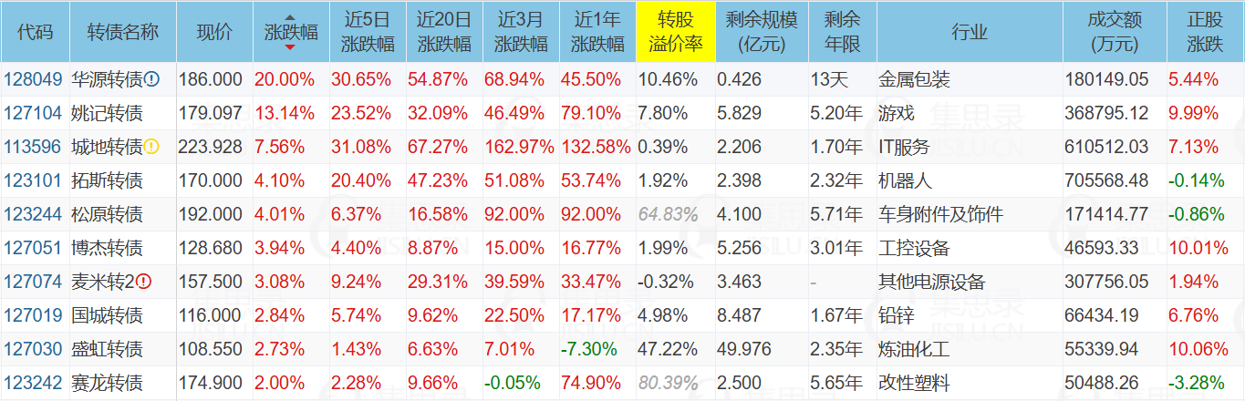 天汽模(-9.93%)、姚记科技(9.99%)、华源控股(5.44%)、塞力医疗(-1.94%)、思创转债(-5.60%)、华源转债(20.00%)