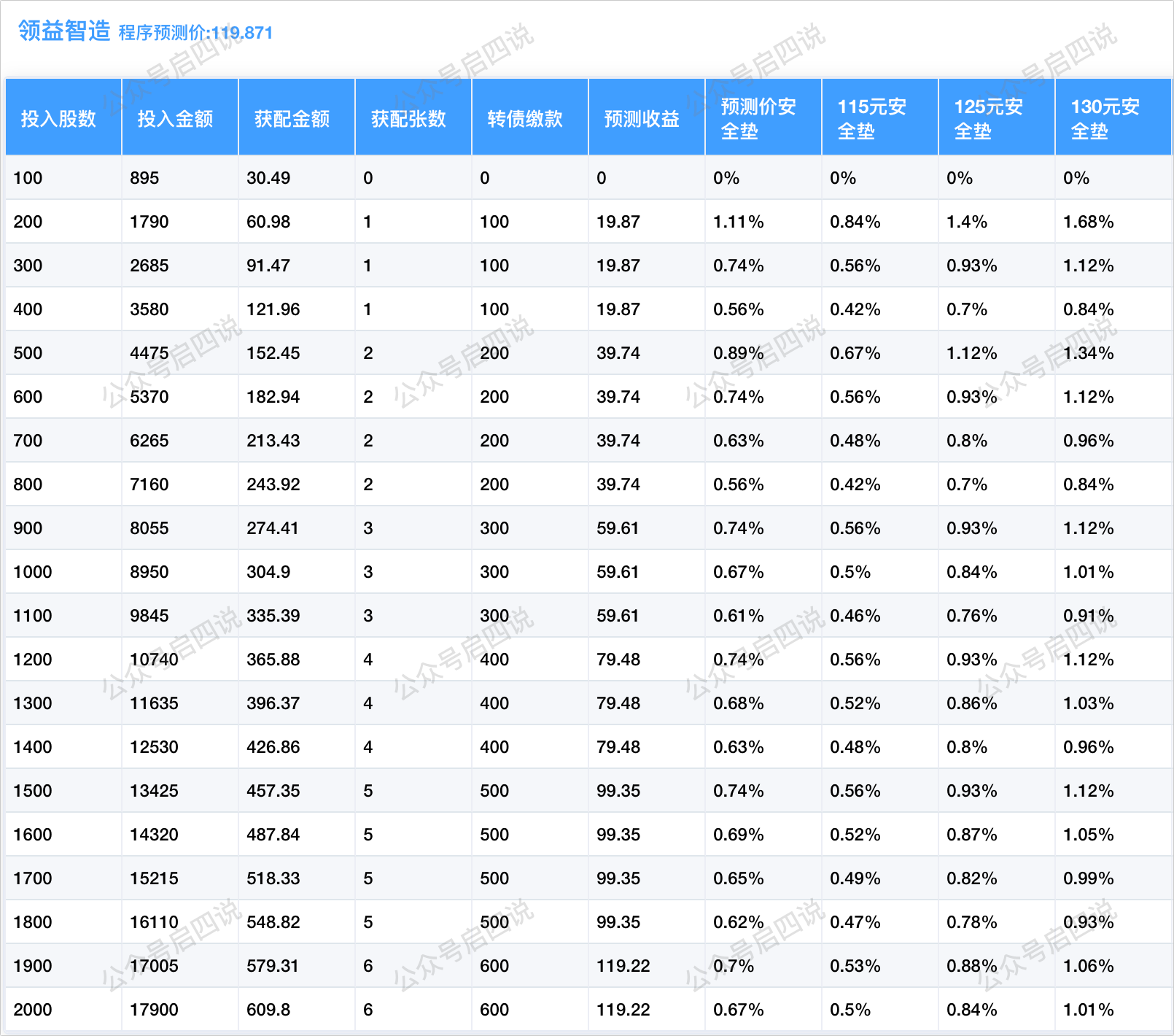 程序预测上市价119.871元,配债所需股数和安全垫可以参考下图: