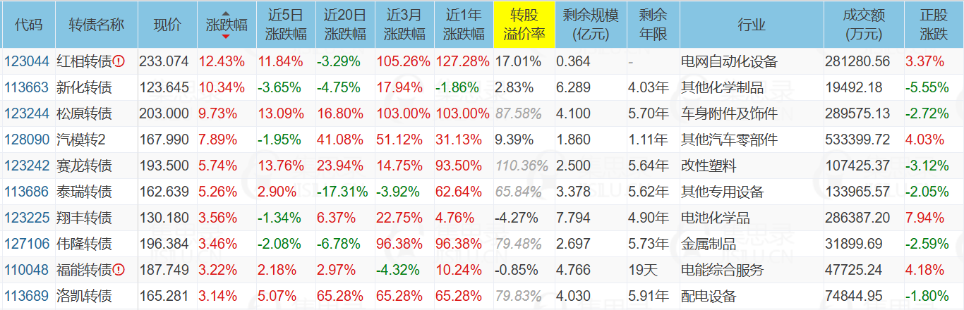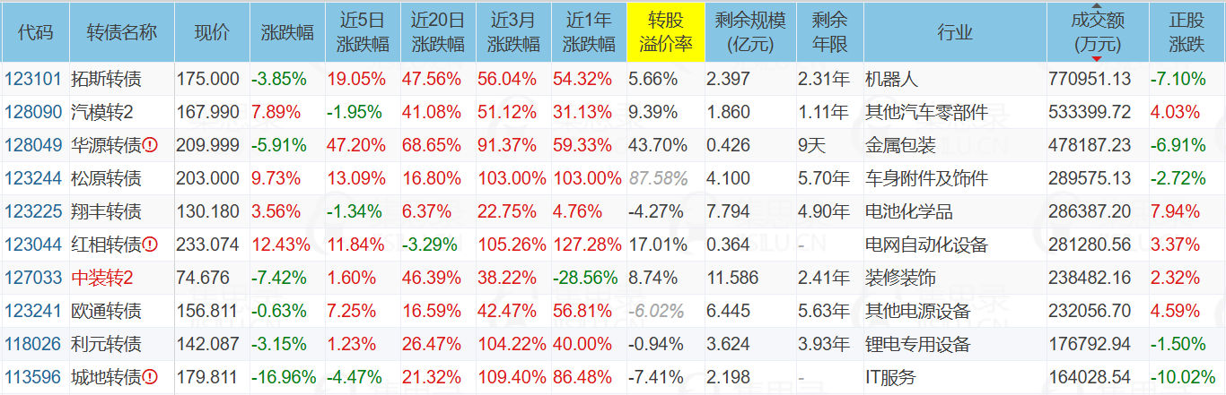 ST中装(2.32%)、欧陆通(4.59%)、润达医疗(-10.02%)、城地转债(-16.96%)、华源转债(-5.91%)