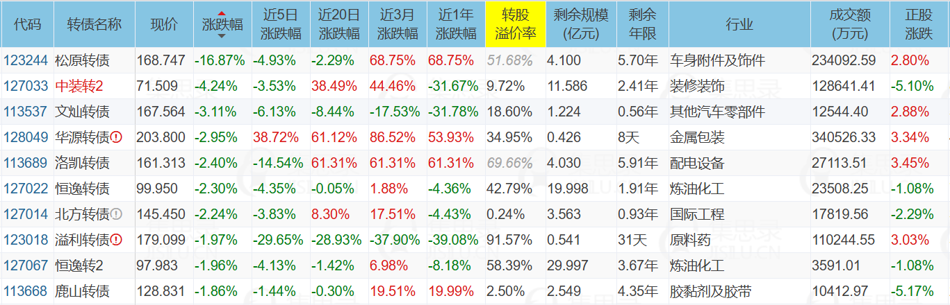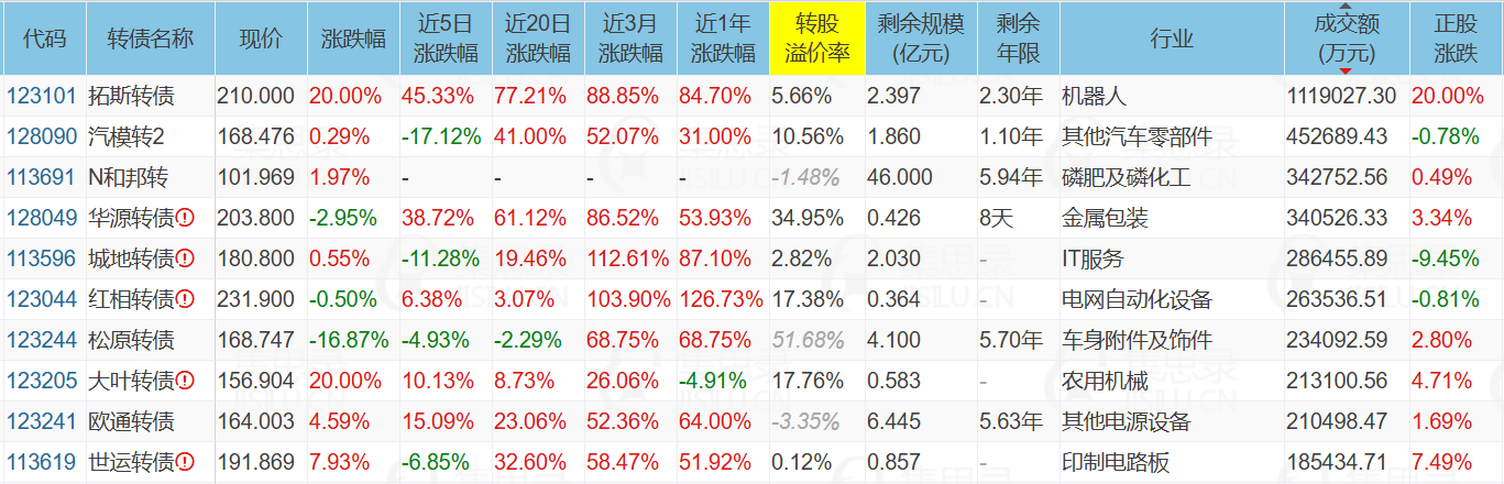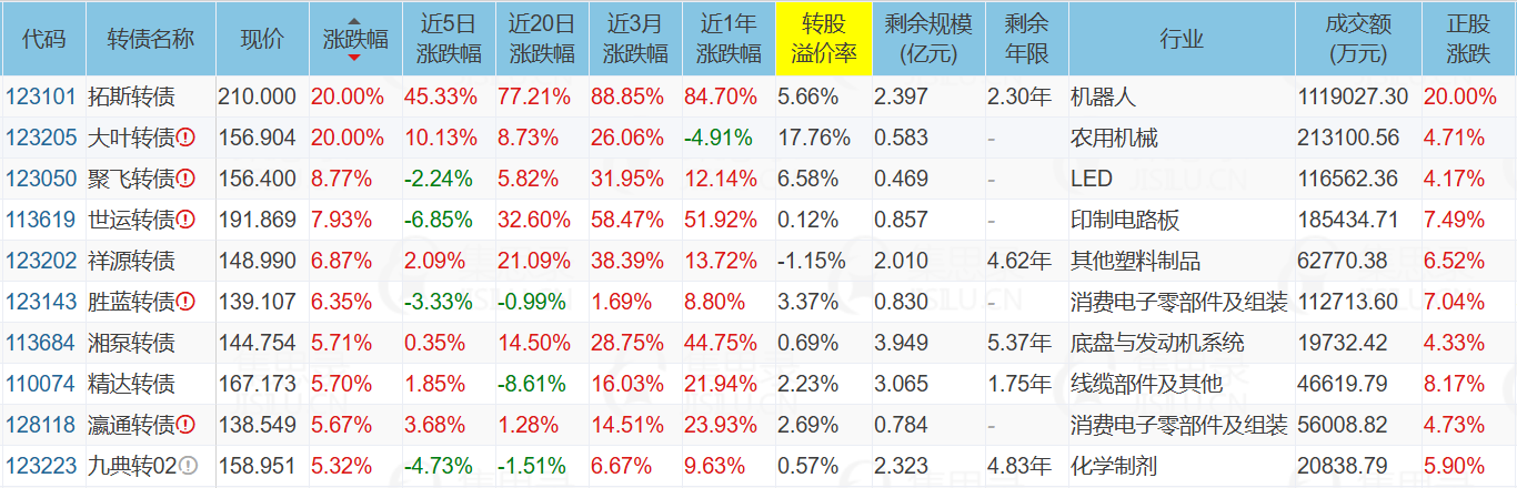 拓斯达(20.00%)、ST东时(-4.96%)、城地香江(-9.45%)、N和邦转(1.97%)、拓斯转债(20.00%)、大叶转债(20.00%)、松原转债(-16.87%)