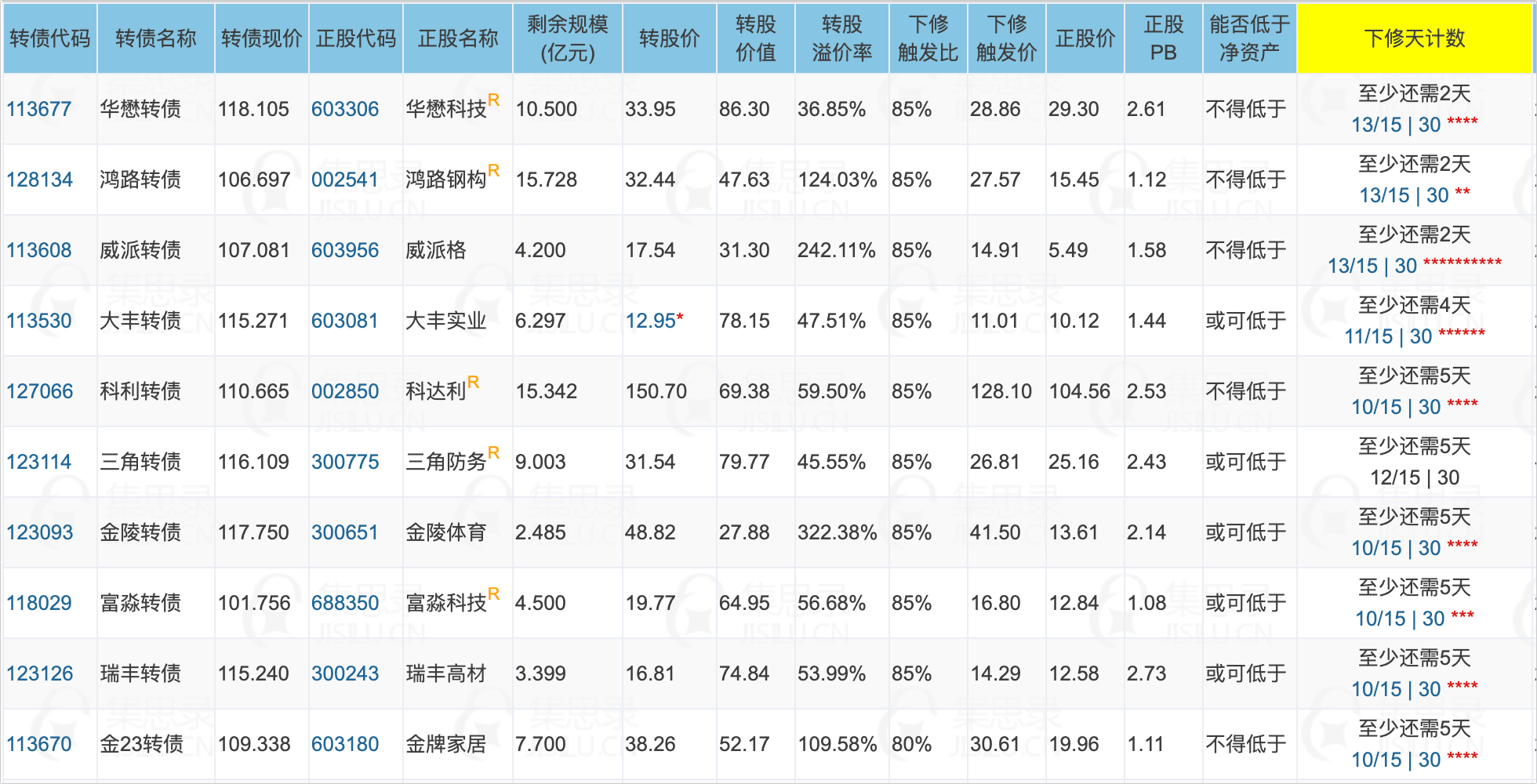 4、下一周,将有10只转债最快可能满足下修条件,其中鸿路转债、威派转债的下修动机较强。