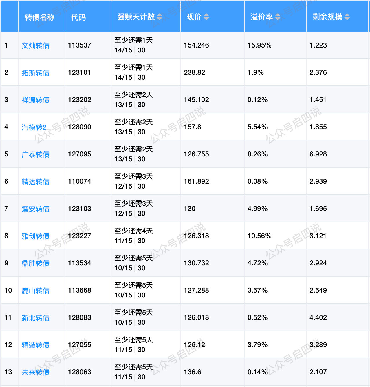 未来1周内,将有13只转债最快可以满足强赎条件或临近退市。