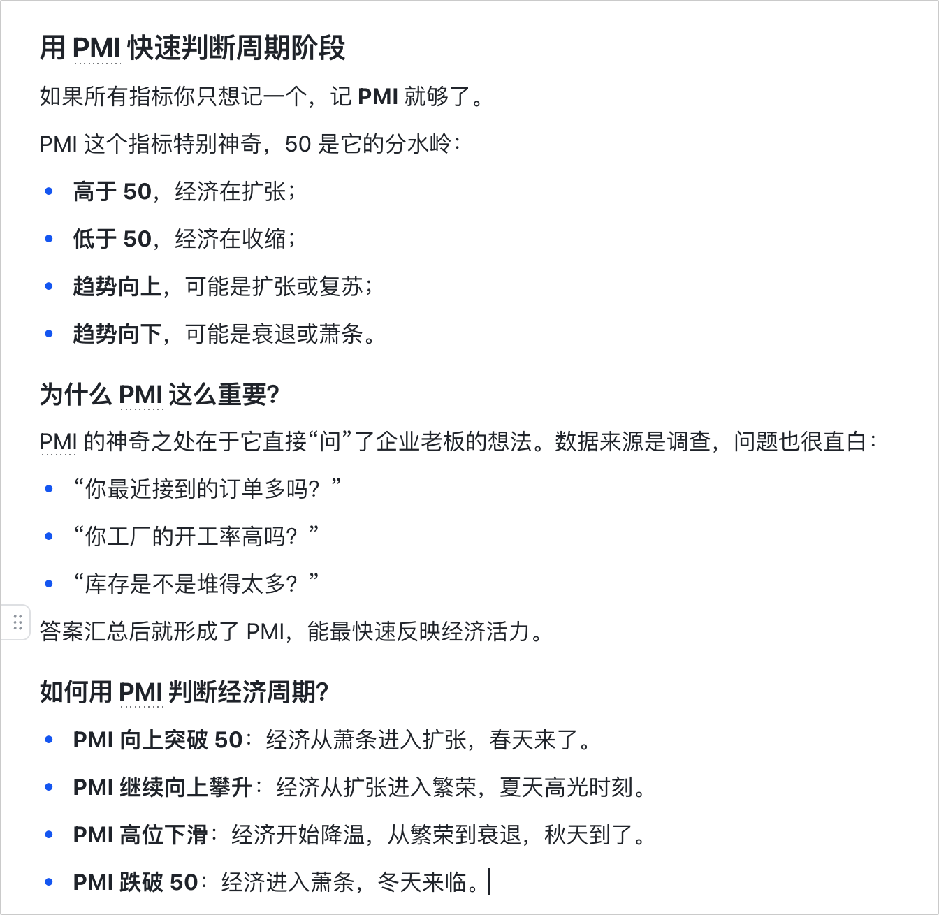之前说过:PMI的数值范围通常在0-100之间。50是个重要的“荣枯线”:高于50,说明制造业处于扩张状态;低于50,意味着萎缩。关于如何进行宏观经济分析和周期定位,我也正在社群里开设专栏讲解,等更新完会考虑开放到公众号,下面是部分截图: