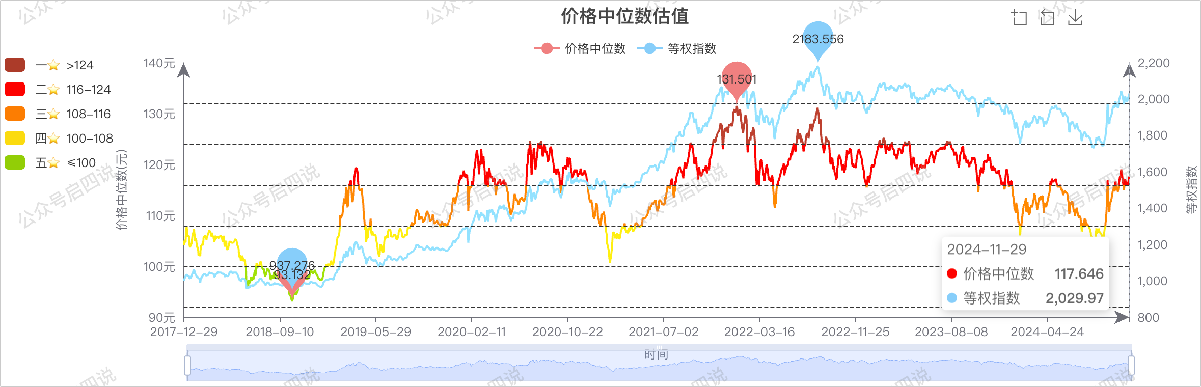 当前中位数:117.646,当前相对上周上涨1.627元,位于二星级估值区
