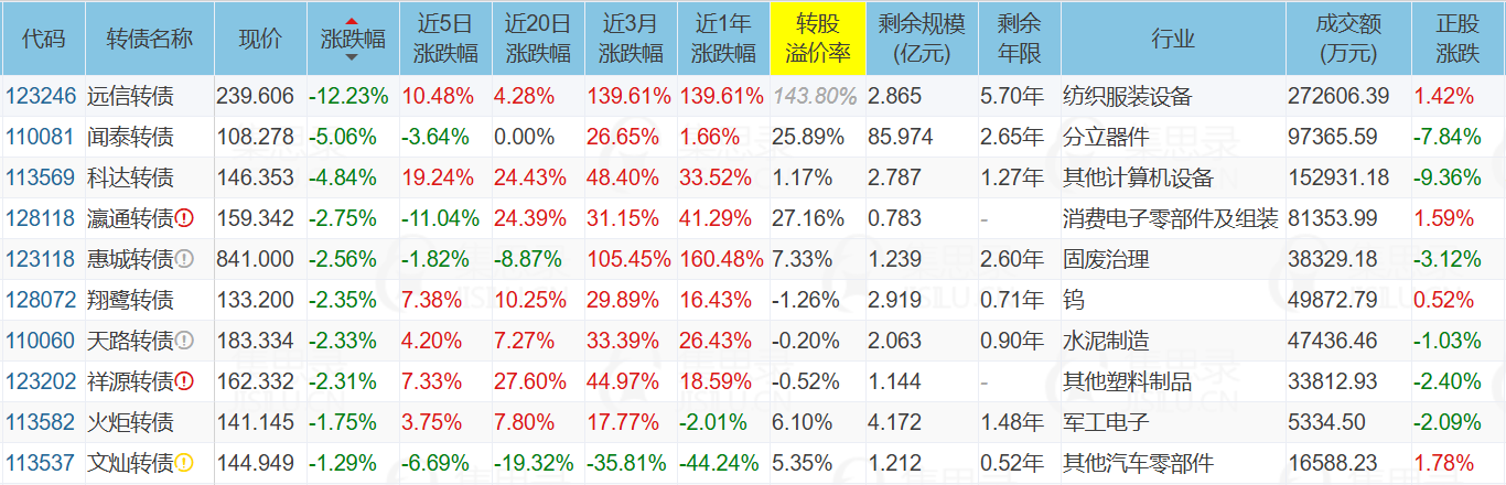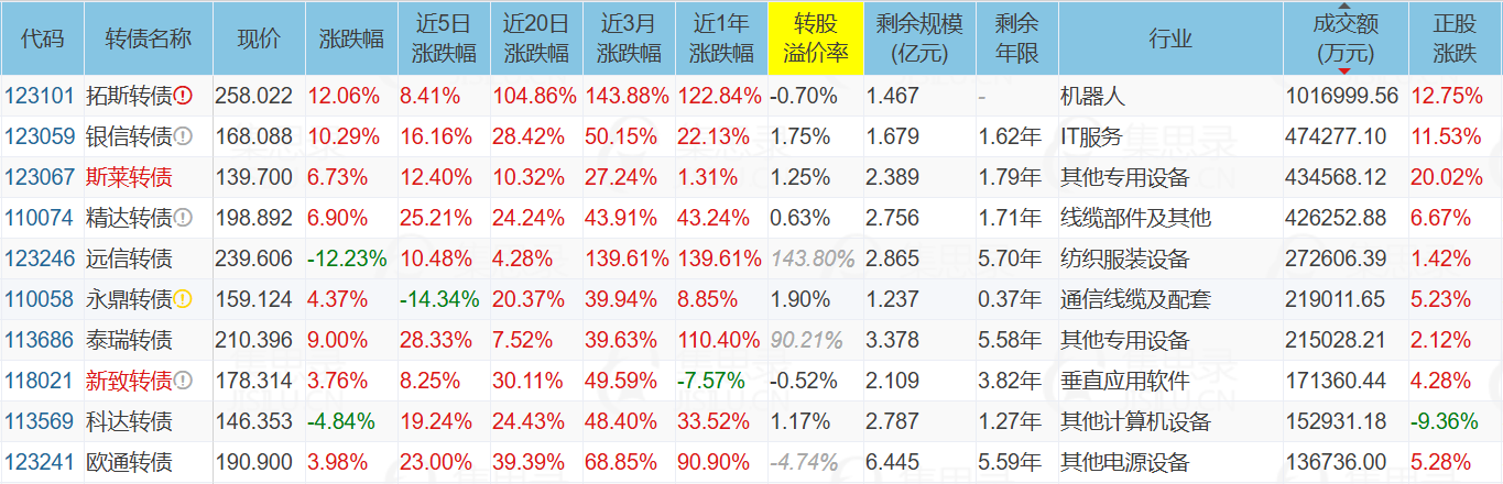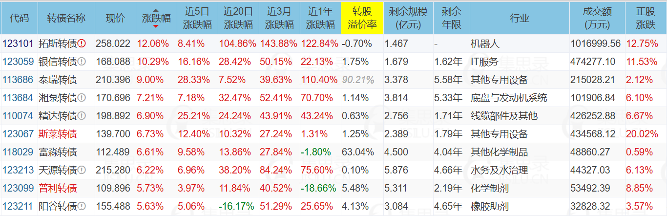 斯莱克(20.02%)、拓斯达(12.75%)、苏州科达(-9.36%)、拓斯转债(12.06%)