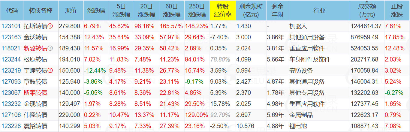 拓斯达(7.61%)、山东玻纤(9.95%)、永安转债(20.00%)、金沃转债(12.43%)