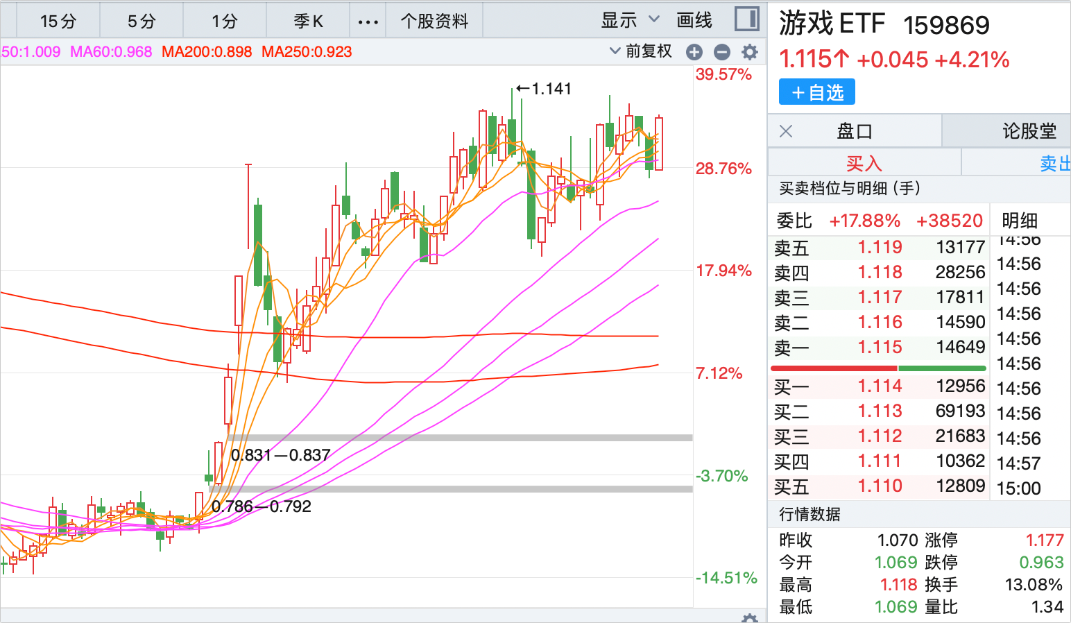 从9月23日到现在,已经接近50%了。虽然比不上科技类的芯片ETF、信创ETF这种大热门(涨幅60%左右),但绝对比通信类的通信、5GETF(涨幅25%-30%)更抢眼。而且游戏ETF的走势更稳,沿着均线上涨,看着就舒服。