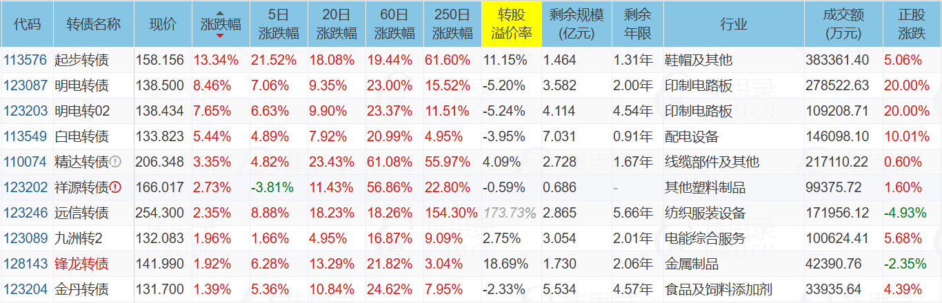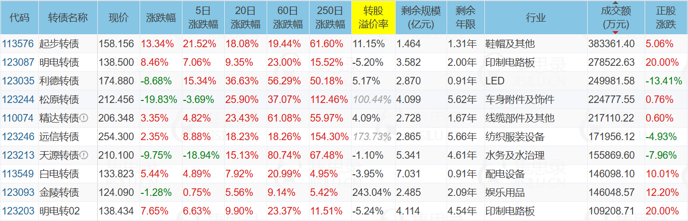 金陵体育(12.20%)、明阳电路(20.00%)、明阳电路(20.00%)、ST起步(5.06%)、灵康药业(-10.05%)、白云电器(10.01%)、山东玻纤(-10.01%)、松原转债(-19.83%)