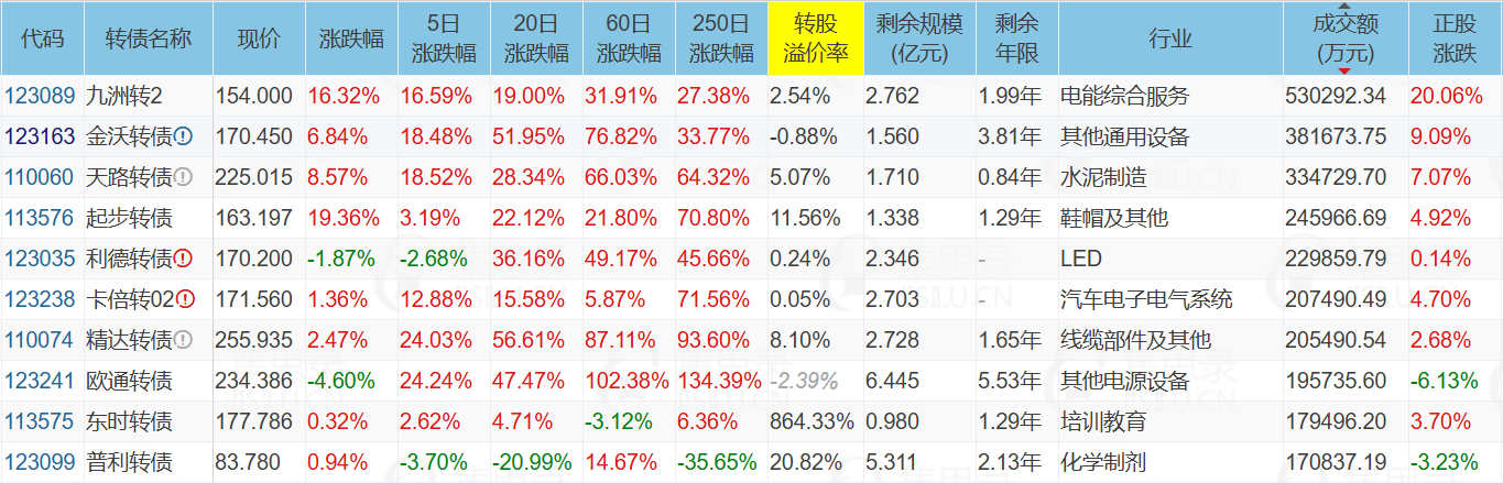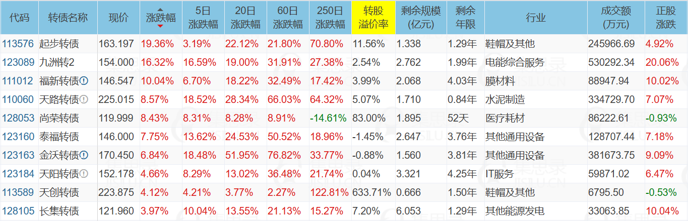 长青集团(10.04%)、九洲集团(20.06%)、佳力图(-10.04%)、起步转债(19.36%)、九洲转2(16.32%)