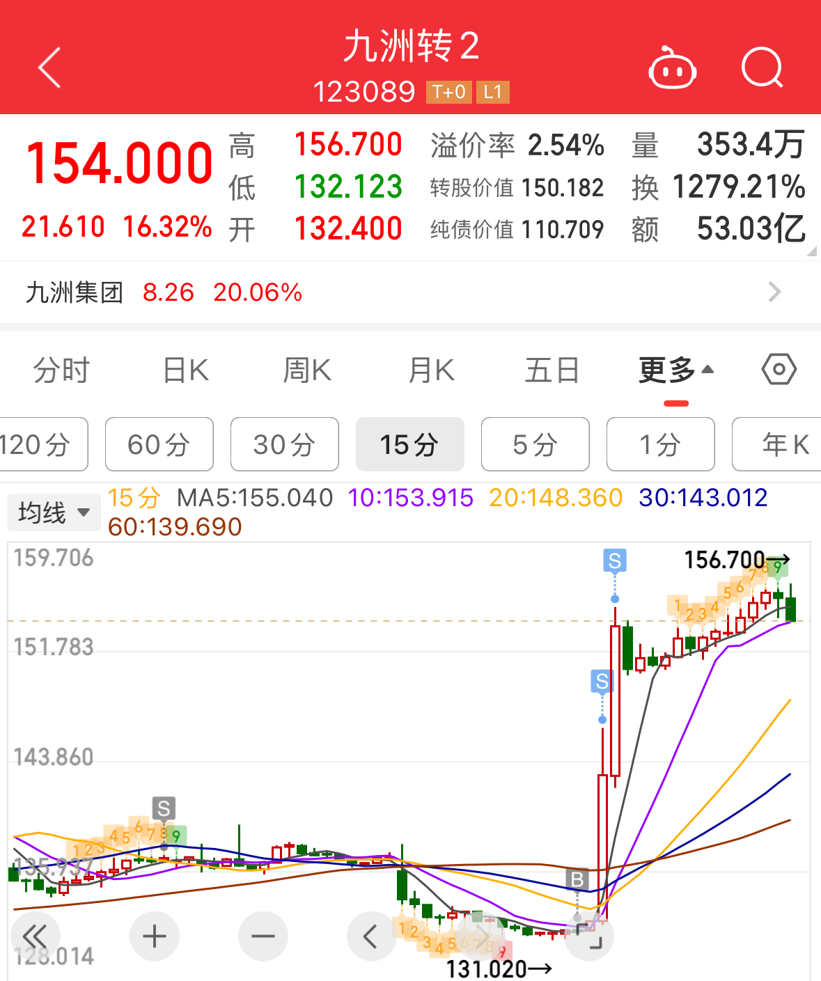 另一只是昨天轮动策略刚刚买入的九洲转2,今天收盘价154元,正股20cm涨停,转债涨幅16.32%。启四在131.692建仓,均价143.406清仓,持仓一天盈利接近9%。