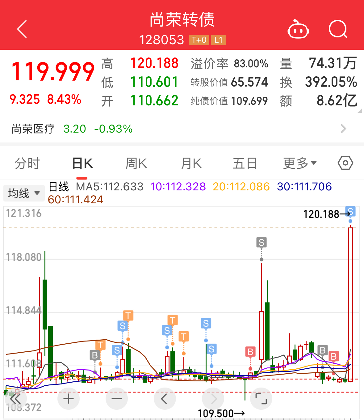 当初买尚荣的逻辑很简单:安全又有潜在爆发力,几乎就是个低风险高收益的“看涨期权”。安全点在哪?这债马上到期了,就剩52个交易日,公司现金足够还债,到期赎回价是110元。所以,111元以下买,最多亏1块钱。而它的爆发点在于规模小,才1.895亿,历史上经常“一飞冲天”,很容易被炒作。说白了,这就是个能随时拉升的小盘债,适合潜伏当现金替代。