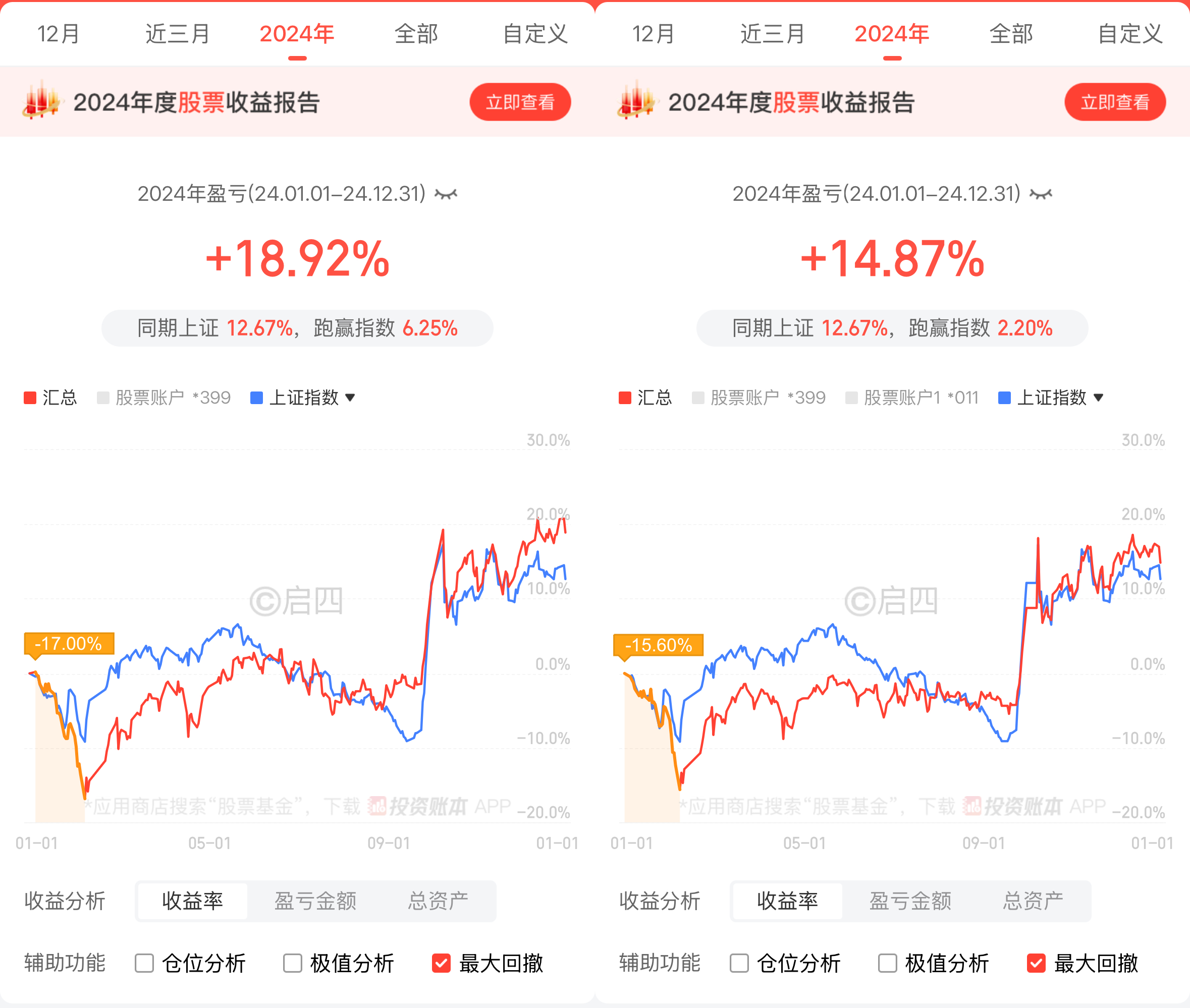 比去年稍差些,去年两个账户分别收益29.98%和13.82%,分别可以击败92%和81%的投资者。
