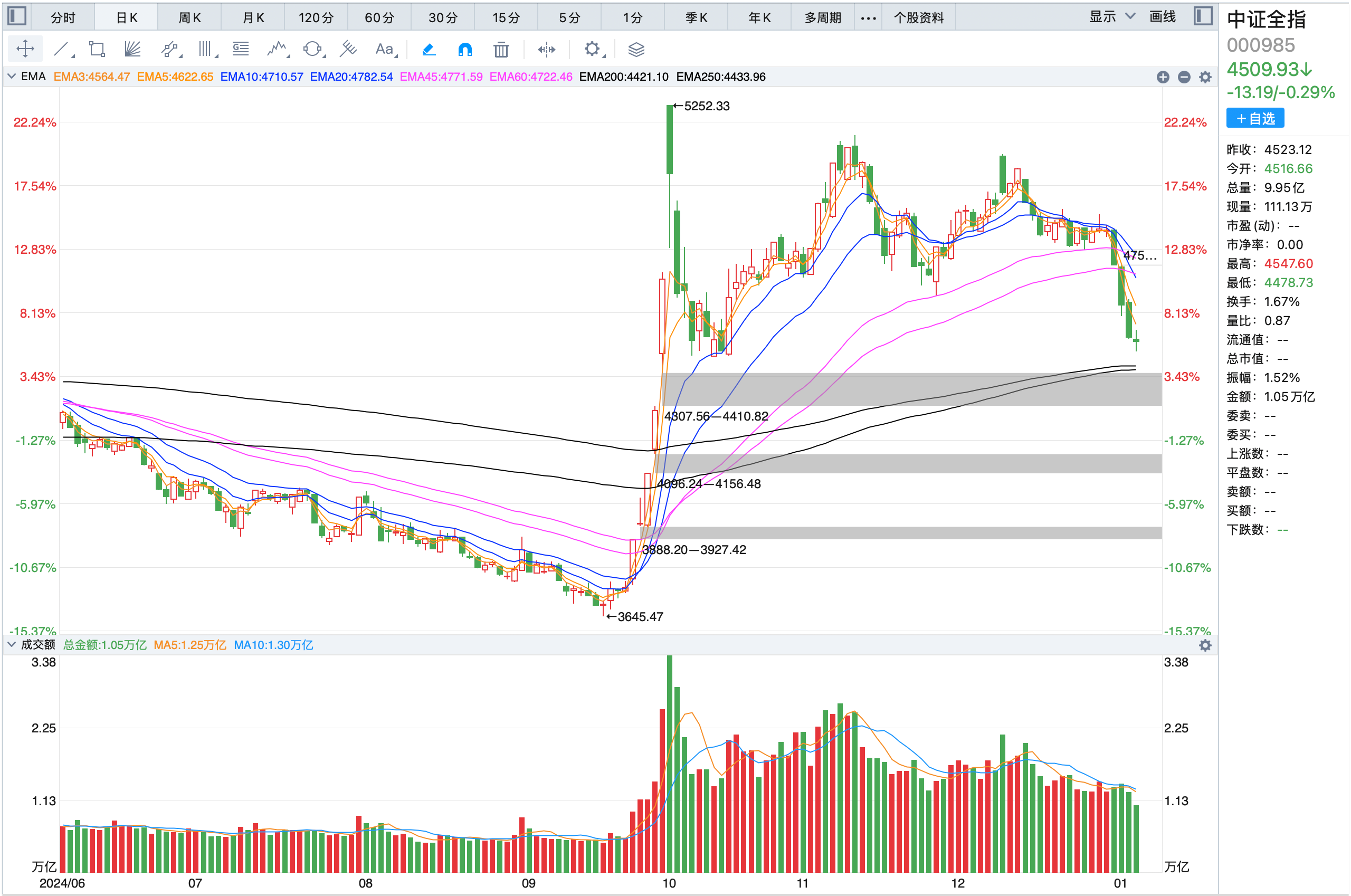 **1、低位十字星。**中证全指大跌之后,今天在相对低位出现了十字星信号,这啥意思呢?就是空方的力量用得差不多了,没法继续碾压了。大跌后,抛售的压力慢慢减弱,空方的筹码基本卖光,多方也不想再割了,大家就这么僵持住了。