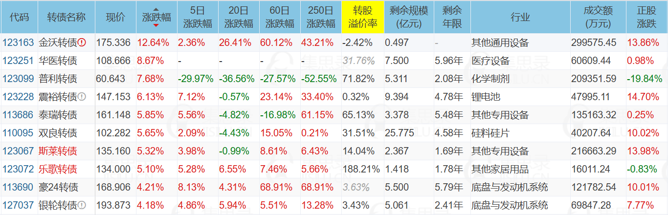 *ST普利(-19.84%)、豪能股份(10.01%)、华医转债(8.67%)
