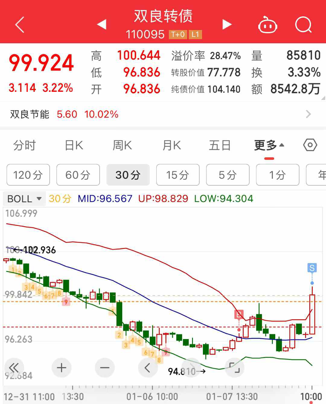 早盘正股涨停时,我在99.55减仓了上次96.9加仓的一半,下午双良转债继续强势上涨,我没有继续减仓了。目前正股和转债都走出了接近光头阳线的走势,且突破了短期均线组,明天继续上涨的概率更大一些。不过即使明天又回调回去了,也无非是再多磨一段时间,现在的价格位置很低,不着急。短期向上的压力位在110左右。