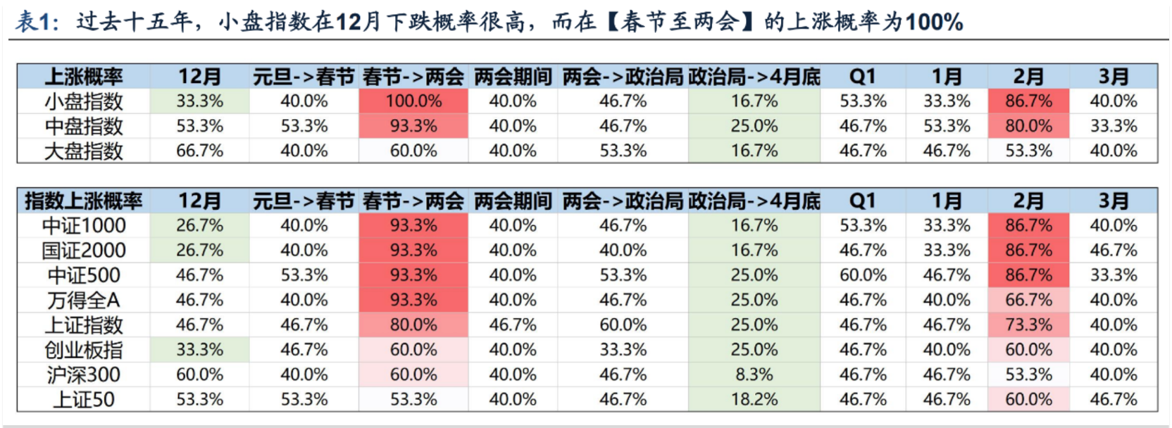 3、日历效应显示,春节后到两会前,中小盘指数上涨概率高达93.3%-100%,尤其是小盘指数,上涨概率100%!这期间最好的行情是2月,中小盘指数上涨的概率超过80%。这段时间可转债会大有可为。
