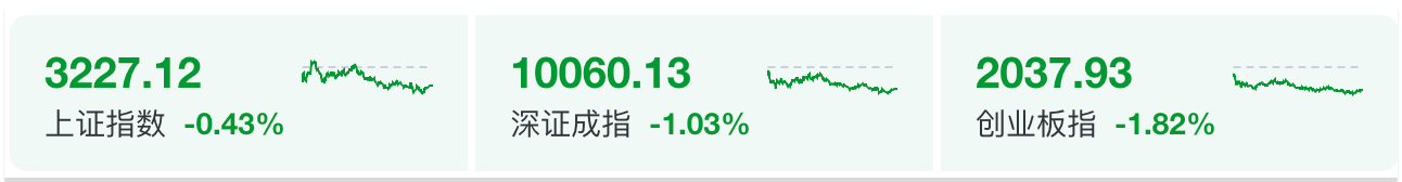 A股三大指数今日集体下跌,截至收盘,沪指跌0.43%,深成指跌1.03%,创业板指跌1.82%,北证50指数跌0.28%。全市场成交额12119亿元,较上日缩量1601亿元。全市场超3500只个股飘绿。