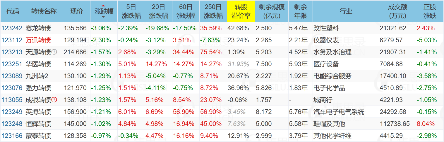 跌幅榜中的万讯转债、九洲转2,年报业绩预亏,且亏损较大。不过后者低开高走,截止收盘转债跌幅已经不大了。