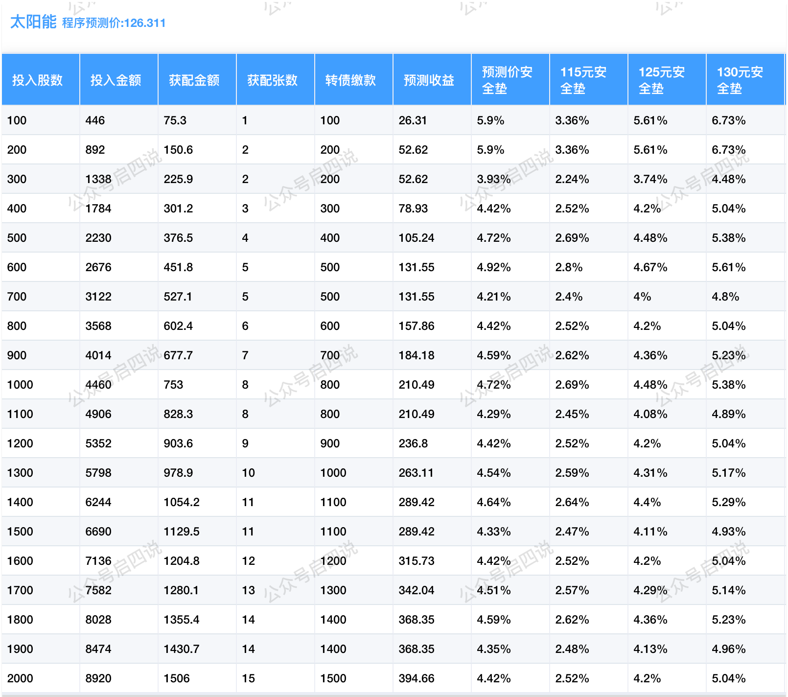 程序预测上市价126.311元,启四预测上市价115元左右,配债所需股数和安全垫可以参考下图: