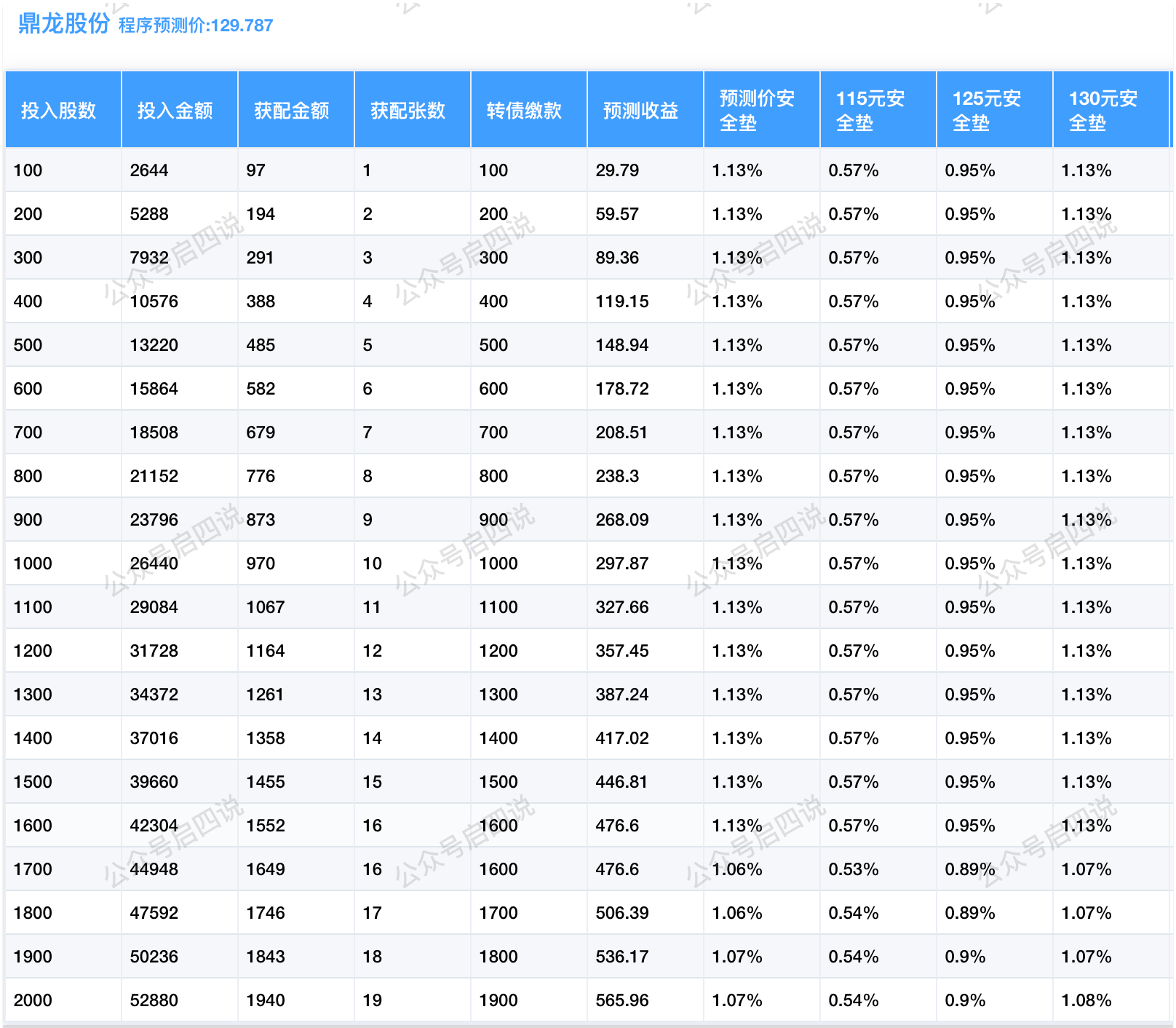 程序预测上市价129.787元,配债所需股数和安全垫可以参考下图: