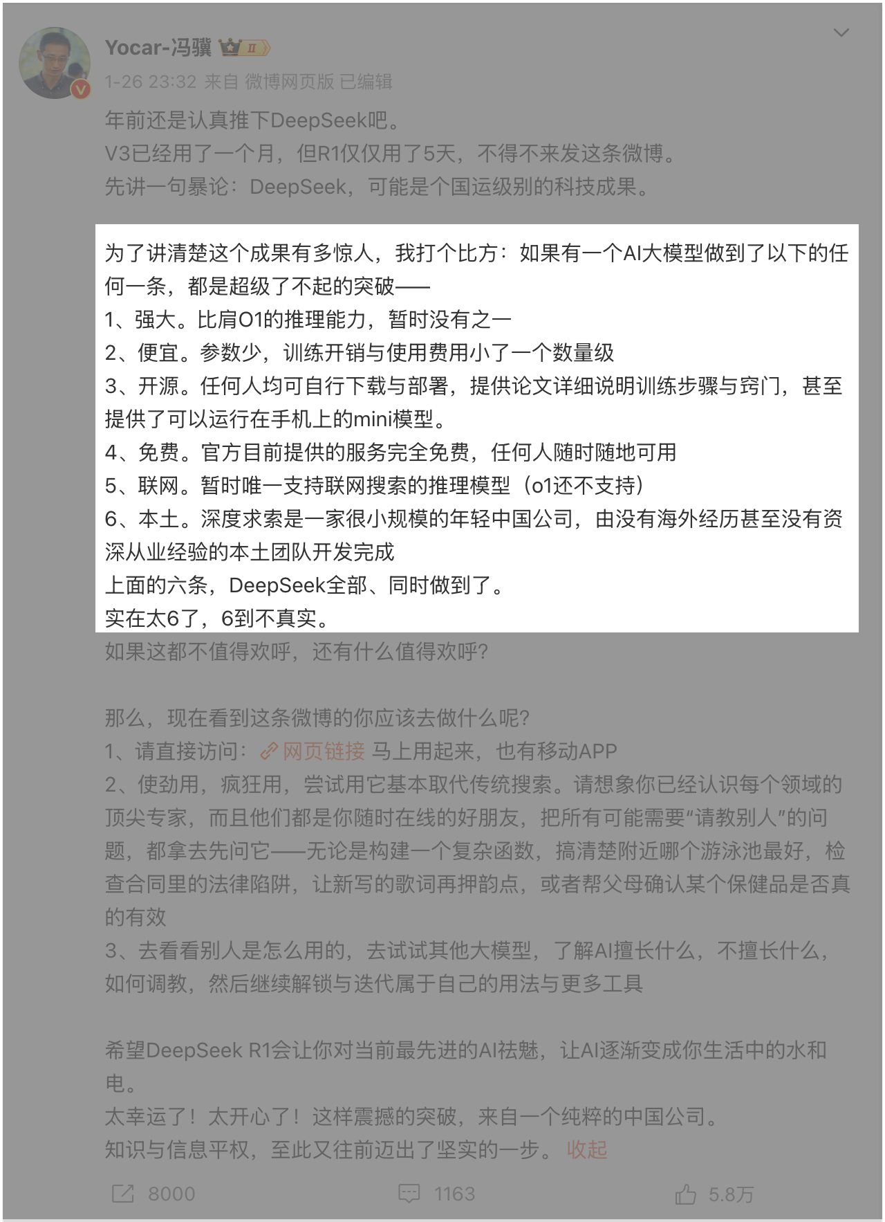 DeepSeek的威力在于“中国的,开源的,低价的,展示思维链的,AI大模型,做到了,全球应用榜第一”。