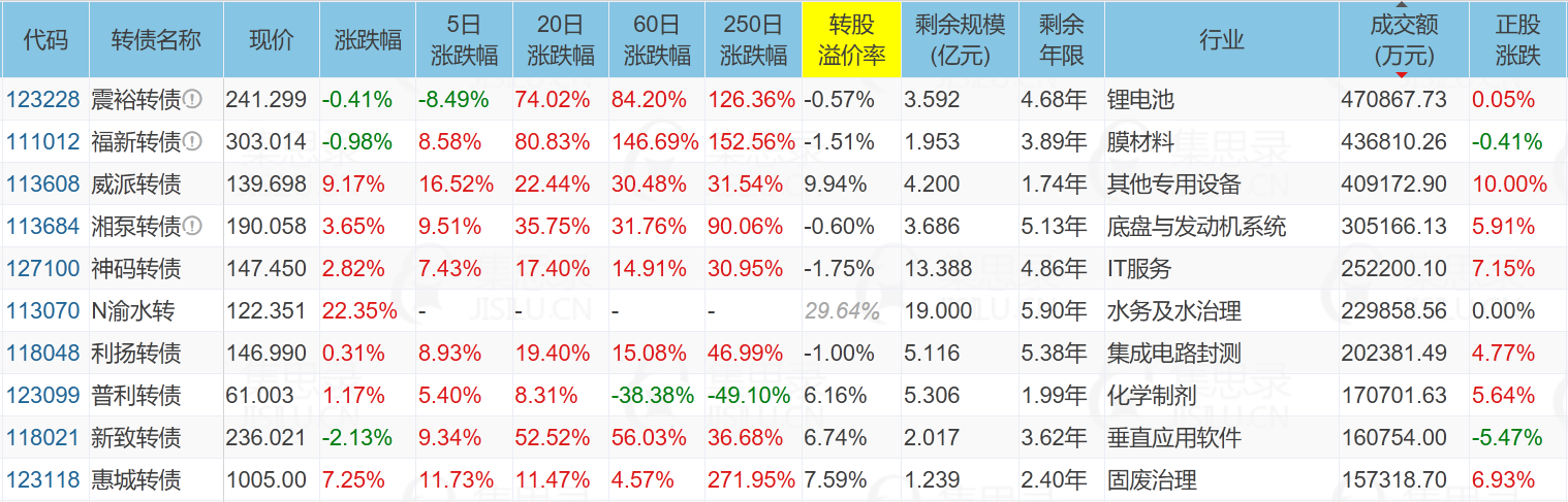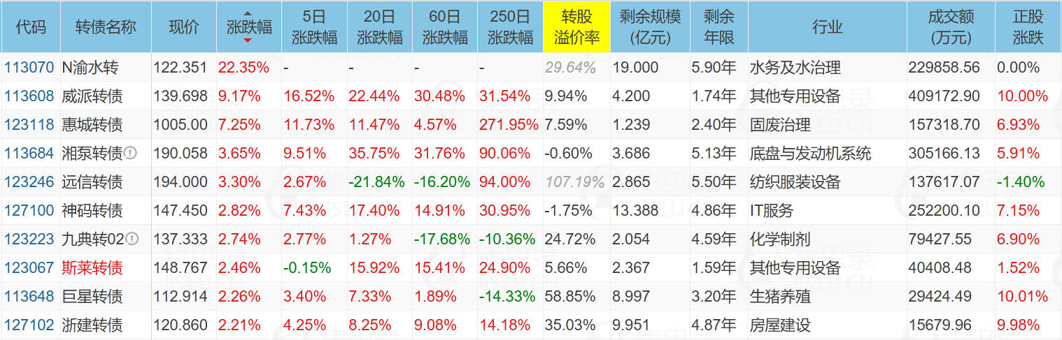快到期的伊力转债是白酒行业,剩余规模2.328亿,到期赎回价110元,现价113.886元,溢价率7.12%,还有30天就到期了,如果白酒能拉升一波,或许能助力它负溢价转股一波。