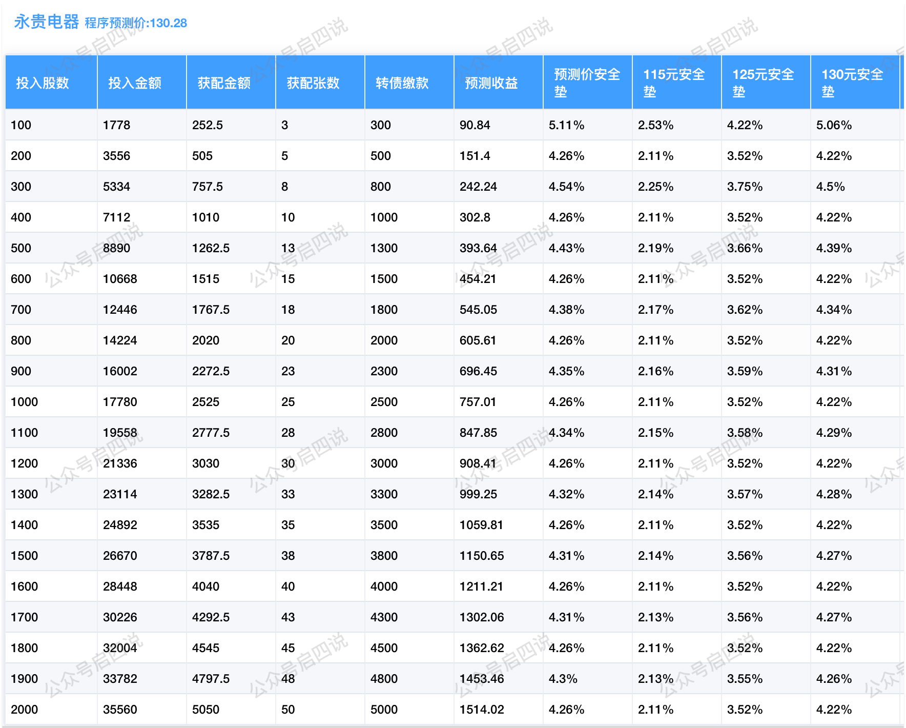 程序预测上市价130.28元,配债所需股数和安全垫可以参考下图: